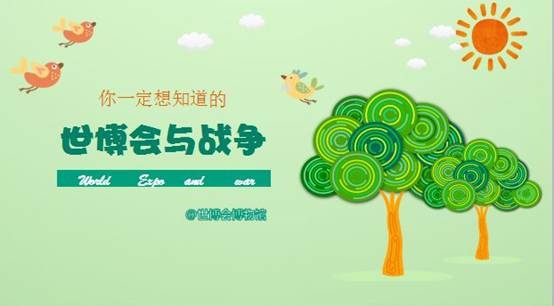 课程内容概要:世博会是什么?战争又是什么?它们有着怎样的联系?今天我们透过战争的足迹来看看当时的世博会,从美国独立战争到一战,再到二战和伊拉克战争,因为战争,世博会曾受到重重考验,但它仍然坚定的延续着,发展着。并且引领人们从对事物的崇拜转向对人的关怀,从征服自然转向尊重自然、从追求增长转向推崇可持续发展。