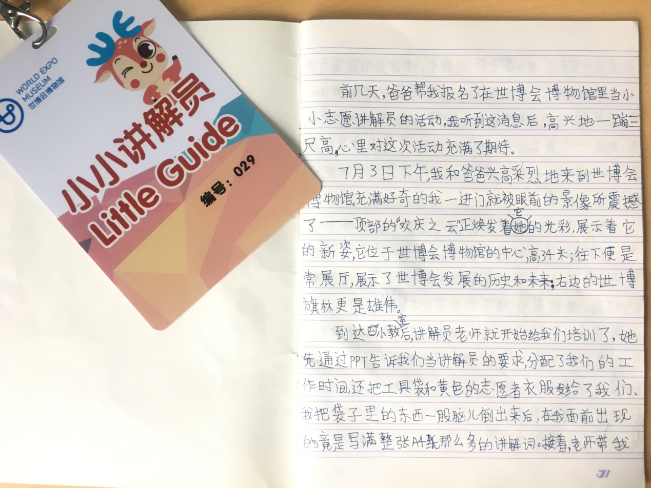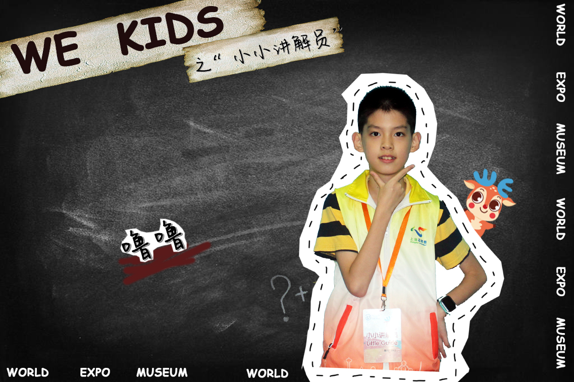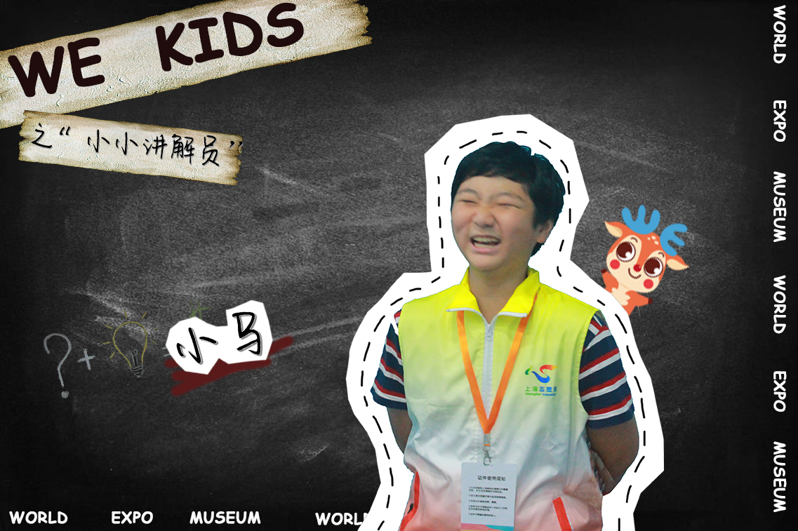 小马出马一个顶俩儿,大高个小马真的是小小志愿讲解员队伍中的大哥哥,但在这个看似稳重的外表下却藏着一颗顽皮的童心,服务之余总会成为团体中的开心果。最可贵的是每次服务过程都在不断进步,从羞涩紧张到泰然自若,还参加了“世博小讲堂”的演出活动,这样一个不断进步的男孩,相信总有一天你一定会是最棒的!