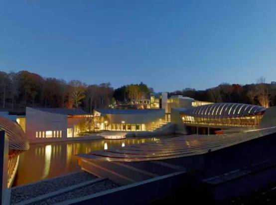 新的水晶桥美国艺术博物馆(Moshe Safdie,2011年)位于美国阿肯色州本顿维尔,博物馆商店就处在博物馆中央。