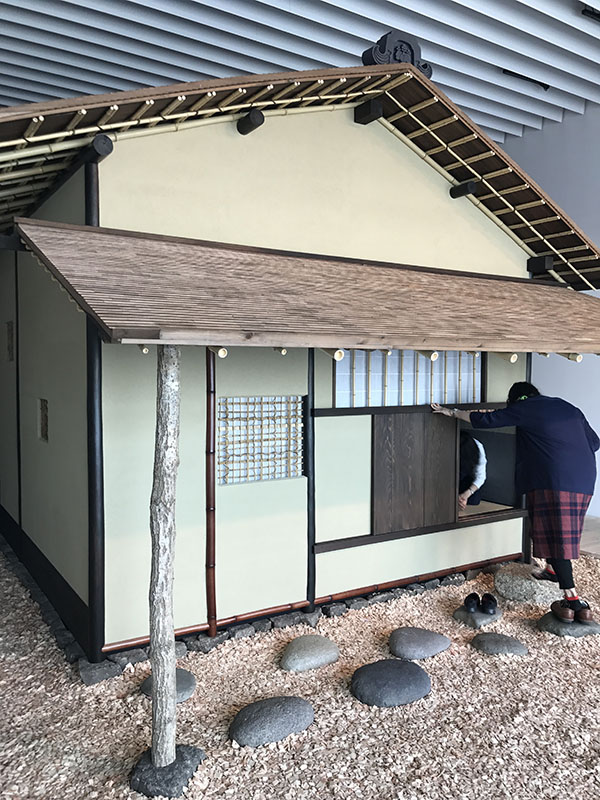 传统的日本建筑不止是人与“神”的桥梁,也是人安放自我的地方。等比例再现的千利休“待庵”是展览“日本建筑:传承的谱系”中最引人注目的项目之一。从几块鹅卵石上走到待庵跟前,脱下鞋,钻进入口的小门,里面一次只能容纳三个人。在这个做什么多余的动作就会撞上哪里的斗室中,除了小窗,几乎看不见其他东西。待庵是丰臣秀吉命令千利休建造的茶室,它的大小只有两叠,被称为“世界上最小的建筑”。在这样的斗室里,千利休泡上一壶茶,招待着一期一会的客人,小小的空间里除了主客以外,只能容下水与茶刷发出的质朴声音,却自成宇宙。