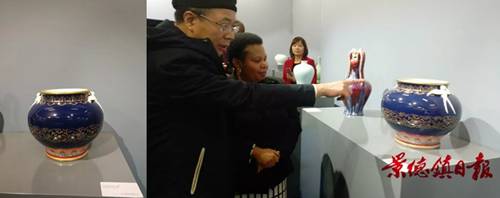 南非文化艺术部副部长马考苏·玛格德琳·苏杜女士带领南非政府官员欣赏熊建军作品《霁青釉描金海晏河清尊》