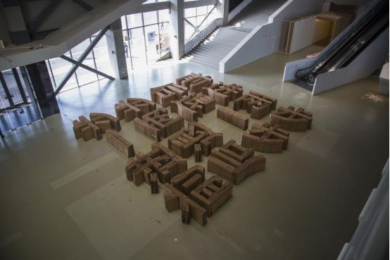 法国艺术家小组克莱尔·方丹将一个无缺口的“苹果”灯箱悬挂于在一楼前台,借助视觉图像讽刺了全球化资本主义所带来的消费文化及道德矛盾。阿根廷艺术家恩里克·耶泽克的作品标题《围地》取自《孙子兵法》,近四千个废纸板组成“前进一步,后退两步;前进两步,后退一步”的文字矩阵。