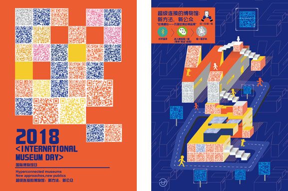 为呼应2018年国际博协主题海报,世博会博物馆专门设计了海报。从整体上看,两款海报在色彩、字体、图案和排版上,给人的印象完全成一个体系,真正达到了形式美的和谐运用。