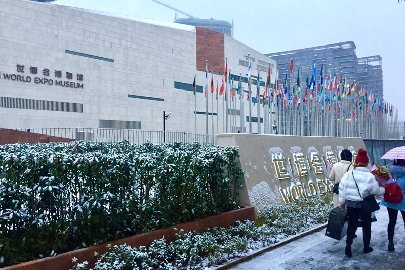积起了厚厚的雪,世博会博物馆也被装扮得银装素裹,美不胜收,引来不少游客前来参观,年轻人还兴奋地在广场上打起了“雪战”。