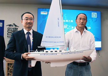 “2015重走海上丝绸之路”归航主题日活动在米兰世博会中国馆隆重开幕。中国著名航海家翟墨船长代表活动组委会将领航船模捐赠给世博会博物馆永久收藏。