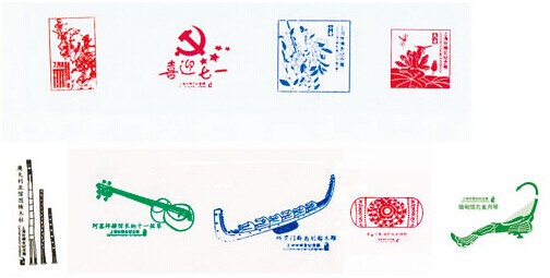 5枚展品章分别是:塔吉克斯坦民族刺绣枕章、缅甸馆孔雀月琴章、澳大利亚馆图腾木柱章、阿塞拜疆馆长柄十一弦琴章和所罗门群岛划船木雕章。印章做工精致,造型各异,图案尽显各国丰富的文化内涵。比如,红色的塔吉克斯坦民族刺绣枕章刻有变化无穷的几何图形,带有浓厚的中亚民族文化特色。所罗门群岛划船木雕章则逼真地展现出太平洋岛国最具风格的民族文化——木雕和独木舟。