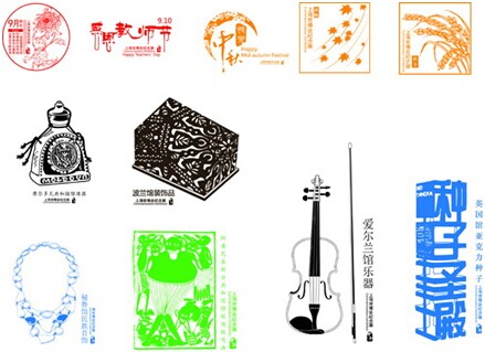 9月份新推出的11枚印章包括6枚世博会纪念展展品章、2枚节庆章、2枚节气章和1枚月章。其中的2枚节气章为立秋章和秋分章;6枚展品章分别是:摩尔多瓦共和国馆酒器章,波兰馆装饰品章,秘鲁馆民族首饰章,坦桑尼亚联合共和国馆挺嘎挺嘎画章、爱尔兰馆乐器章和英国馆亚克力种子章。在展品章中,波兰馆装饰品章的图案呈现漫天的镂空花纹,仿若民间剪纸。英国馆亚克力种子章则由“种子圣殿”四个立体字构成通透的柱状体。挺嘎挺嘎画章呈现的画面淳朴而豪放,直观又抽象,显现出人类对原生态的向往和追求,让人感受非洲文化的魅力。