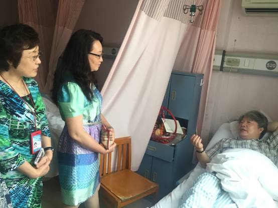 7月21日下午,世博会博物馆馆长刘绣华、党总支书记蒋莎等同志顶着烈日前往医院及员工家中,看望慰问了病中的俞力同志和陈晓波同志。馆领导仔细询问了他们的病情及治疗情况,表达了组织和全馆同事的关心与问候,嘱咐他们安心养病,争取早日康复。