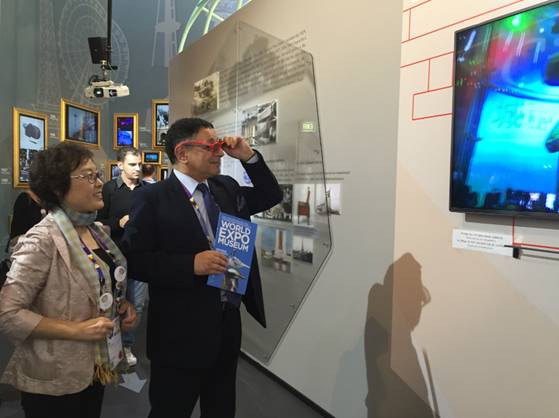 波兰馆总代表Slawomir Majman(右一)参观世博会博物馆展示馆