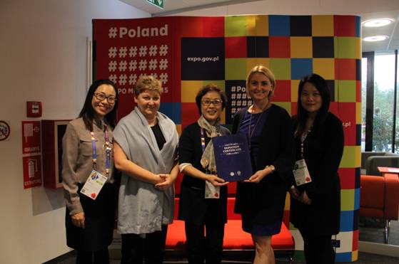 与波兰馆馆长Agnieszka Ciecwierz(左二)及副总代表Karolina Dresler(右二)会面