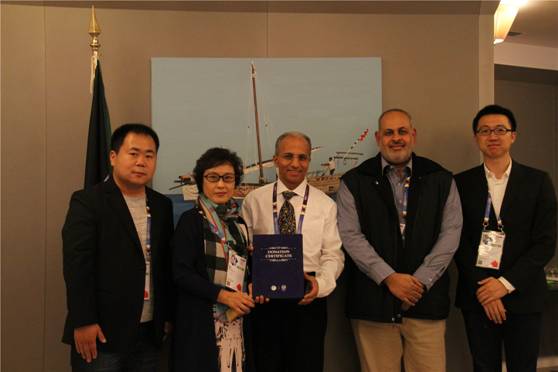 世博会博物馆展示馆馆长蒋莎(左二)向科威特馆执行副馆长Mazen Ali Alansari(左三)颁发捐赠证书;船模手工艺人Hussain Alqallaf(右二)也出席了捐赠仪式。