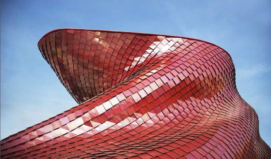 米兰世博会万科馆以“食堂”为主题,以“盘龙”为建筑形象,整个场馆形似一条腾飞的红色巨龙。万科馆外立面由4000余块红色陶板所覆盖,在阳光照射下仿佛一片片闪光的龙鳞。陶板在生产过程中产生的废料、废水,全部经重新处理并再利用,烧窑的能源由沼气提供,将对环境的影响减少到最小。此次,万科馆将其中一块“龙鳞”陶板捐赠给了世博会博物馆,该陶板由万科董事会主席王石亲笔签名。