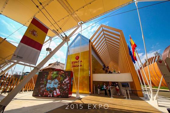 西班牙馆旨在表现西班牙传统食物与现代创意烹饪法的融合。场馆整个的外部空间都似乎在阐述着西班牙的传统烹饪方式,使用了许多材料来进行装饰,比如红酒瓶塞、橡木桶、茅草编织物(用来过滤橄榄油的材料)。
