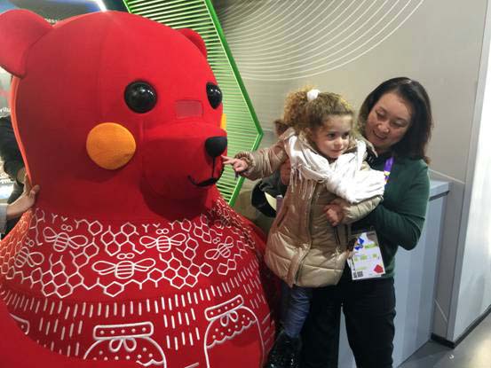 小参观者见到此次征集成果之一俄罗斯馆吉祥物Mishka非常高兴