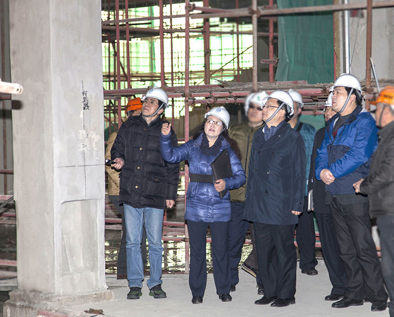 上海市委副秘书长、市委宣传部副部长朱咏雷2月2日走访世博馆新馆建设工地(摄影:项欣荣)