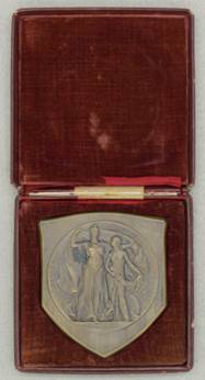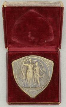 这是一套完整的圣路易斯博览会的奖牌,共五枚,全部由亚历山大·韦曼(Adolph Alexander Weinman 1870-1952)设计。从这届世博会开始,世博会奖牌才真正有了金、银、铜牌的概念,并且首次出现了世博会的异型奖牌。这届世博会的大奖牌呈五边盾形,金牌和纪念奖奖牌呈三角盾形,银牌为正方形,铜牌为圆形。所有奖牌正、背面的中间圆形图案都是一样的,只是不同等级的奖牌上铸有“大奖牌”(Grand Prize)、“金牌”(Gold Medal)、“银牌”(Silver Medal)、“铜牌”(Bronze Medal)、“纪念奖牌”(Commemorative Medal)等英文字样。奖牌正面是两位女性,举着美国国旗、代表美国的高个女人,张开双臂欢迎正在脱掉法国斗篷、代表路易斯安那的矮个女人,加入到美利坚怀抱中来,两人背后一轮红日正在冉冉升起,象征着美利坚合众国进入了一个新的发展时期。奖牌背面上部那只展开双翅的白头鹰是美国的国鸟,象征美国。奖牌的材质都是青铜合金,由位于费城的国家造币厂铸造。