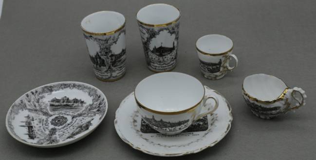 该套装为7件套,由2个瓷碟、5只瓷杯组成,均镶金边,饰有该届世博会场馆图案。该届世博会共设有八个主题展馆,分别为生产馆、电气馆、机械馆、运输馆、综合工业馆、教育和社会学馆、矿产和冶金学馆以及文理学科馆。