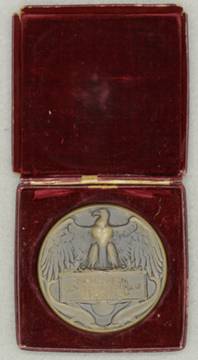 奖章背面分别饰有身着古典服饰和手持月桂树环的人物造型授奖的场面。图案四周文字为拉丁文:“WELTAUSSTELLUNG 1873 WIEN”,中文意思为:1873年维也纳世博会。图案的左下方小字凹刻雕刻师的缩写。
