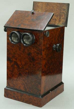 该大型实木制立体照片观片器为19世纪70年代产物,其设计巧妙,前侧镜筒由两片透镜组成,外部由木箱包裹,箱内可存放数张立体照片并由侧边大手柄旋转控制翻动。使用时,将顶部盒盖掀开,眼睛贴近镜筒,旋转侧边小旋钮调整至合适焦距,便可观察到清晰的立体影像。