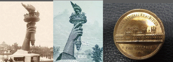 印章的图案是自由女神紧握火炬的右臂部分(1876年费城世博会)。