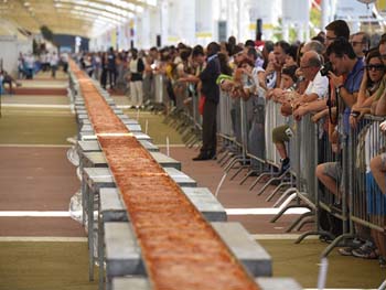 世界最长比萨饼20日新鲜出炉。它的“出生地”可不寻常,是正在火热进行的2015年米兰世博会。