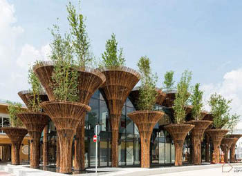 米兰世博会越南馆是由Vo Trong Nghia Architects设计。其灵感来自莲花,该展馆由一些坐落于水池上的用竹木包裹的伞状结构组成,上方种有植物。