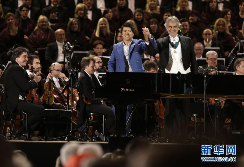 4月30日,在意大利米兰大教堂前的多莫广场举行的2015米兰世博会开幕晚会上,中国钢琴家郎朗(左)与意大利男高音歌唱家安德烈·波切利在演出后向观众致意。新华社记者叶平凡摄