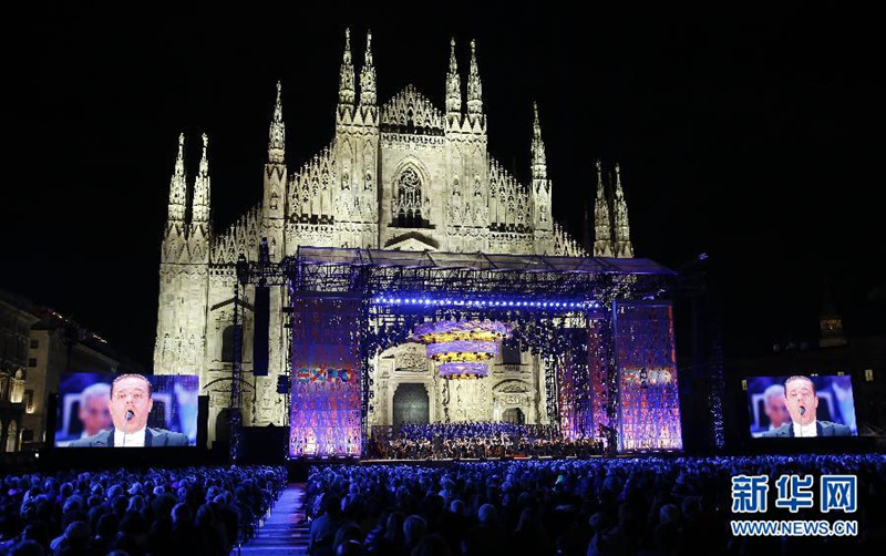 4月30日在意大利米兰大教堂前的多莫广场拍摄的2015米兰世博会开幕晚会现场。新华社记者叶平凡摄