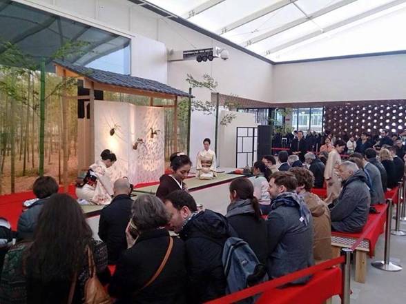 日本馆:日本馆以天然竹子和木头为建材,同时强调和谐与科技。策划的活动和装置用意在刺激五感,日本馆以“和谐多样”为主题,提出日本饮食文化可作为健康、永续及平衡的饮食范例,并建议日本饮食文化可作为减轻饥饿及全球生态问题的模式。日本馆建筑仿京都传统房屋,入口宽敞,作纵向延伸。使用竹子、木头等天然材料,展馆正中央的木头不仅仅是建筑结构的一部分,更象征了如植被、森林等自然元素,而“自然的睿智”又正是2005年日本爱知世博会的主题。森林与植被被视为从陆地到海洋的生命循环中不可或缺的一部分。树木代表着与日本里山的关联,里山是日本丘陵地带的农业区。自然森林区在传统上常被用于耕种稻米、竹子和其他代表性产品。里山在当今被视为日本的自然遗产。