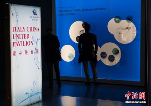 当地时间5月28日,意大利威尼斯,2015米兰世博会——威尼斯水馆内的意中联合馆推出了一批中国传统的字画作品,引得当地游客驻足观看。