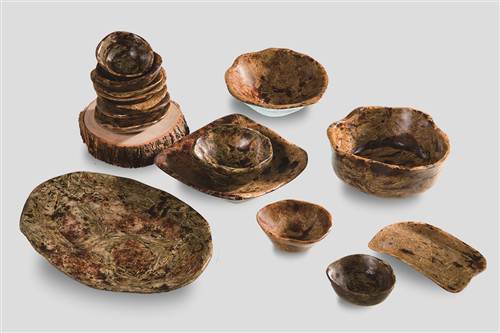 一层层的纸经过涂刷、打磨,再用漆艺工艺制作,变成了充满肌理感的食物器皿。
