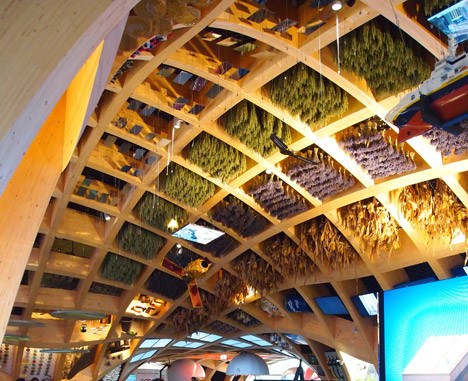种植在馆内天花板及其四周的农作物,大多为易生长的产物。例如一进馆便能嗅到淡淡香气的香草类植物,以及顶层的啤酒花,都是在开幕时栽种的,本次世博闭幕前就能丰收,届时也会举办相关活动,邀游客共同庆祝。