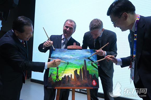 中国贸促会副会长王锦珍、上海市政府秘书长李逸平、米兰世博会意大利馆馆长斯蒂法诺·嘉蒂以及意大利驻沪总领事裴思泛为“上海”上色添彩。