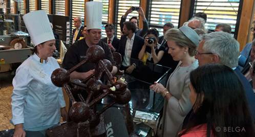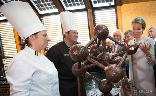 2015世界博览会在米兰拉开绚丽的篇章。作为比利时皇室御用巧克力品牌,GODIVA歌帝梵巧克力大师Chef Ilse Wilmots受邀参与制作重达11公斤、以比利时原子球为原型的巧克力雕塑模型,并在比利时王后马蒂尔德亲临国家馆日开幕当天,神秘揭幕。香浓醇厚的比利时巧克力在大师的精工细作中神奇般的支起9个圆球并接连成一个正方体,王后马蒂尔德对这一巧克力微缩模型表示出极大的兴趣,并与GODIVA歌帝梵巧克力大师Chef Ilse Wilmots亲切交谈。