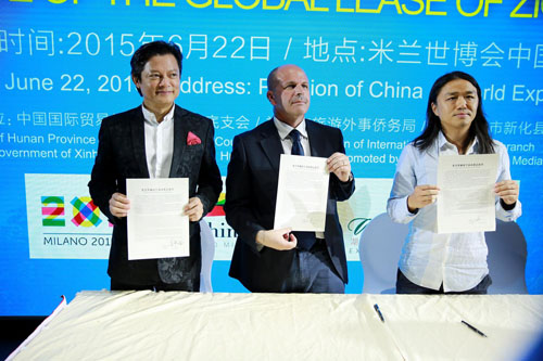 亮点一,紫鹊界梯田全球同耕世界共种首发仪式。这次紫鹊界推展活动借力世博舞台,正式全球发声,发布全球认租消息可谓最大爆点。令人振奋的是,意大利海滨旅游名城波利尼亚诺阿马雷市市长多明戈、中国三大男高音歌唱家之一莫华伦、2015紫鹊界世博之旅国际文化艺术交流大使、旅意著名华人艺术家、亚洲首位欧洲精神圣地阿西西“和平骑士”刘义现场签约意向书;利用世博平台国际名人的影响力和国内外媒体联动,让紫鹊界梯田认租模式得到广泛关注,让农民受益,让远古农耕文明的种子播撒在全世界希望的田野上,这也是东方智慧的集中体现。