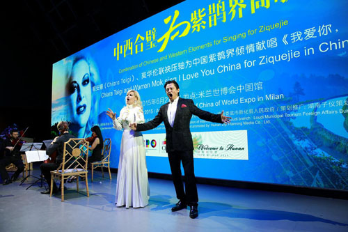 亮点四:中西合璧国际巨星演绎经典。“有着天使般歌喉”的世界著名女高音歌唱家姬安娜(Chiara Taigi)和中国三大男高音之一的著名歌唱家莫华伦联袂主演的“中西合璧专场歌剧音乐会”成为当日中国馆的爆点。特别是两位巨星现场即兴献唱的《我爱你中国》赢得了雷鸣般的掌声,继而把推介会开幕式推向巅峰。