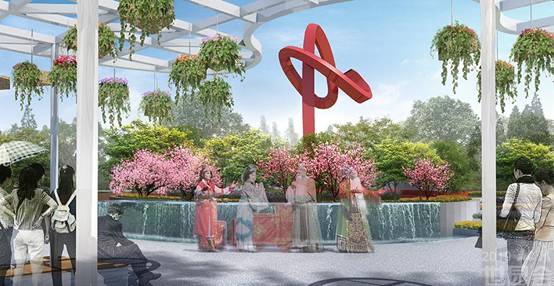 河南是中国姓氏的重要发源地,百姓花林将通过一百支纸飞机形式的迷你雕塑展示百家姓。廊架的纸飞机飘荡在半空,游客可在飞机上寻找自己的姓氏,完成一次趣味十足的寻根之旅。逐水飞花将以主体雕塑结合花台搭配跌水为背景,前方是一处小型广场,可作为表演舞台,重要节日展示河南豫剧等特色文化,舞台南侧有龙形廊架结合坐凳,为舞台表演提供观演席位,廊架也可为游客临时避雨所用。