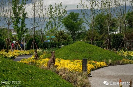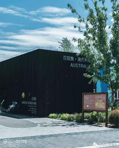 澳大利亚展园的整体呈金色。为体现实用性和可持续性的理念,材料上选用了中国本土材料,打造了具有澳大利亚特点的展园。