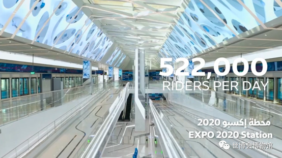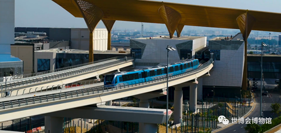 园区入口的地铁站已经建成,这是专为迪拜世博会建设“2020地铁线”项目七个站点的其中之一。该项目是连接世博园区与沿谢赫扎耶德大道行驶的“地铁红线”的延长线,长15公里。世博会地铁站每天的总客流承载量为52.2万人,双向每小时2.9万人。