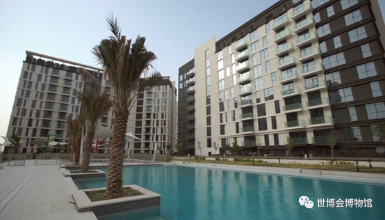 世博村是参展方在迪拜的家,共有2,273套公寓,分四栋。每栋都包括游泳池、儿童游戏区和停车场。这些住宅楼从10到16层不等,并配置美丽的景观设施。
