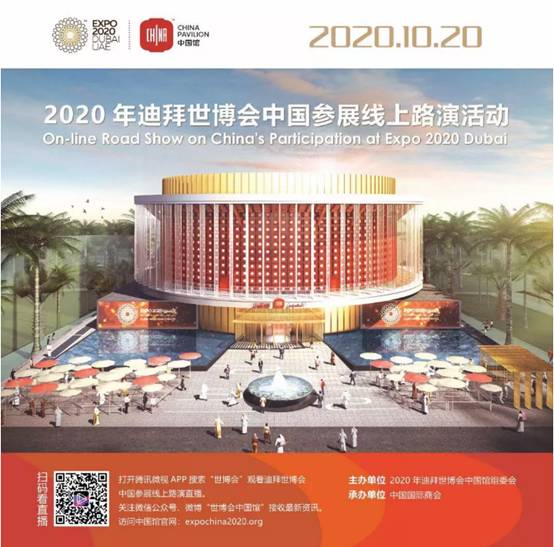 2020年10月20日下午,2020年迪拜世博会中国参展线上路演成功举办。本次路演活动采取线上直播形式,发布迪拜世博会和中国馆筹办最新进展。中国贸促会副会长、迪拜世博会中国馆政府总代表张慎峰,中国驻阿联酋大使倪坚,阿联酋驻华大使扎希里,迪拜世博局副主席杰拉维等嘉宾在线致辞并见证中国馆封顶。