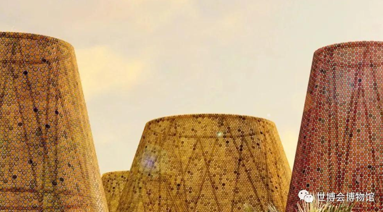 马德里建筑师Amann-Canovas-Maruri为西班牙馆设计了一系列锥形结构,旨在促进隔热和隔音效果。该建筑采用木材,铁和织物等可回收材料建造,结合传统的保温技术和创新解决方案,为地下室展览空间提供庇护。