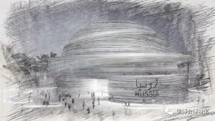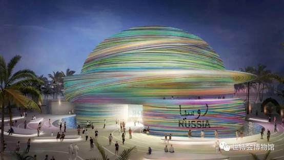 2020年迪拜世博会俄罗斯馆设在流动性展区,以“创新思维,驱动未来(Creative Mind: Driving The Future)”为主题。其占地面积4562平米,27米高,螺旋上升的顶点是彩色的拱顶。在夜晚灯光的闪烁下,流线性立面更是显得绚丽多姿。