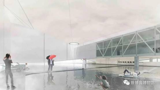 2020年迪拜世博会巴西馆设在可持续区。巴西馆占地4000平方米,主题为“共谋可持续发展(Together for Sustainable Development )”。中央是“可行走冲浪板”似的水面广场,展馆为想要在巴西馆中感受水面区域又不想湿鞋的参观者,准备了曾在威尼斯风靡一时的金色靴子(Goldon boots),以便让他们有更好的沉浸式体验。广场四周用高度为18.5米、宽度为48米的拉伸结构包围,由轻盈的白色织物围挡,在围挡上用图像投影的方式,重现巴西大河流域的景象、声音和气味。这一动画与互动感并存的空间,白天时可以保持水域的清凉,夜晚时变成了一个浮动的立方体。