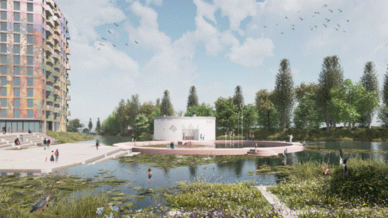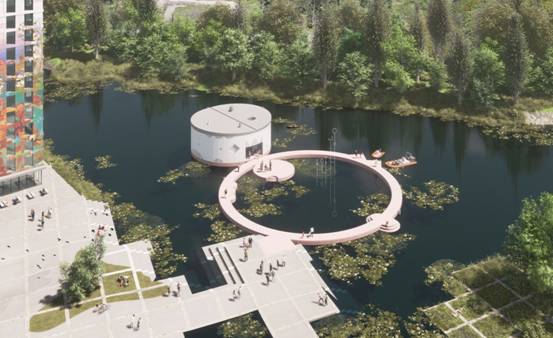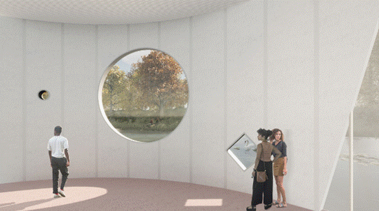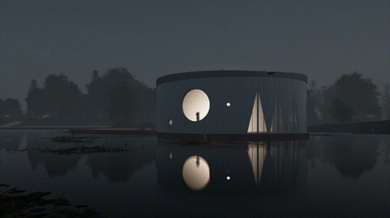 Ossidiana工作室的灵感来自弗莱福兰省的大海和维尔沃特湖,展馆将坐落在那里。他们的设计特点是三个圆:港口,舞台和观景台。港口是一个环形的水上长廊,游客可以在这里散步,也可以进行户外活动。舞台是一个岛屿,也可以作为平台,但会像一个漂浮的平台在强风中漂流。该港口由Ossidiana工作室开发的水磨石制成,参照弗莱福兰的土壤并使用了贝壳、贻贝、粘土和木炭。观景台有两个展览空间,位于第三个圆形平台上。它提供了一个从内到外梦幻的视野。轻质聚碳酸酯圆柱形立面过滤并反射水绿色的色调。游客的剪影投射在立面精心设计的开口上,创造出一种艺术景观。
