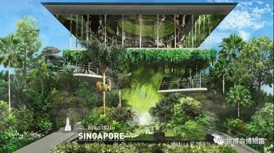 展馆注重生态设计,依靠太阳能和海水淡化系统运作,力求能源消耗净值为零。其遮阳棚和细雾的冷却作用,使温度可下降5至10摄氏度。新加坡展馆由WOHA设计,设在永续区,建筑面积1550平米,高度9米。设计师希望表达一种建筑融于自然、且两者界限模糊的概念,设计了三个巨型的花园椎体,展馆主体看上去像一个悬空花园。人行道环绕于绿化之中,参观者从底层进入绿树成荫的世界,经白色蜿蜒的步道到达顶层花园的天空市场,在这里可以购买新加坡特产或品尝传统美食。