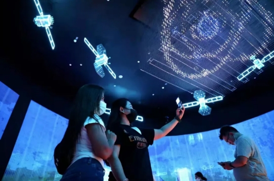 探索北斗分展区,游客举起手机进行拍摄