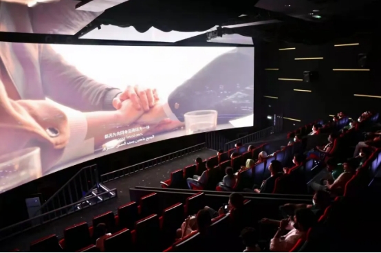 中国馆主题影院,观众佩戴口罩观看影片《启航》
