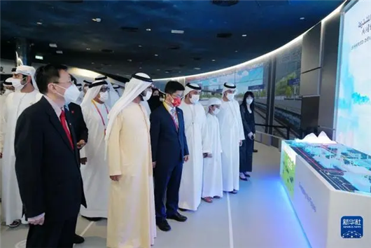 10月1日,阿联酋副总统兼总理、迪拜酋长穆罕默德·本·拉希德·阿勒马克图姆(前左二)在中国驻阿联酋大使倪坚(前左一)和中国驻迪拜总领事李旭航(前左三)陪同下参观世博会中国馆。
