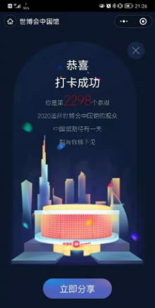 小程序内还能在线观看中国馆主题电影、观赏大型灯光秀、了解精彩的省市及企业活动。游客还能在小程序中打卡,并将足迹分享到朋友圈,在千里之外给中国馆点赞。
